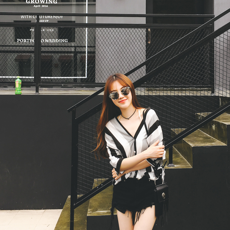 寬條紋,前后V領,下擺系帶,蝙蝠袖,單排扣寬松雪紡襯衫