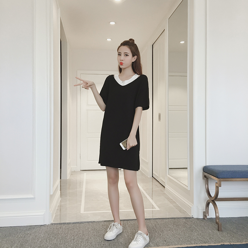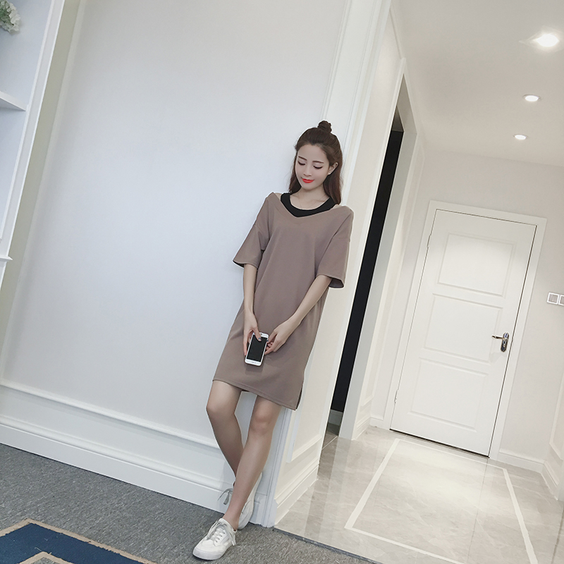 夏季新款女裝韓版中長款一字領T恤女短袖打底衫寬松露肩上衣