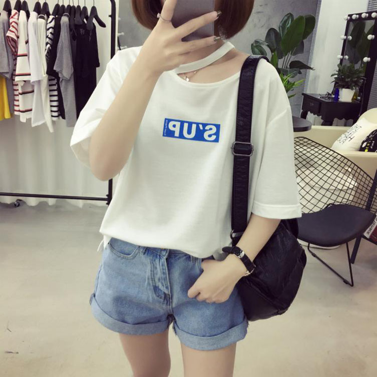 / 短袖t恤女新款掛脖上衣女字母寬松半袖休閑小衫學生百搭體恤