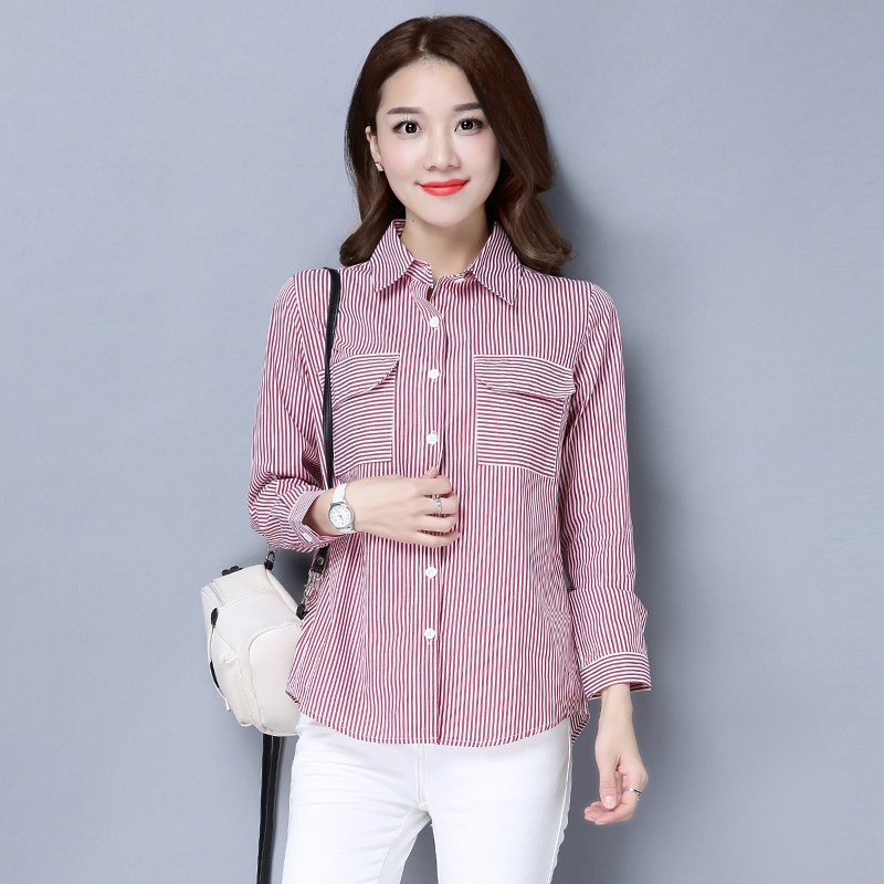/ 春季新款韓版寬松條紋雙口袋長袖襯衫女上衣百搭純棉打底襯衣