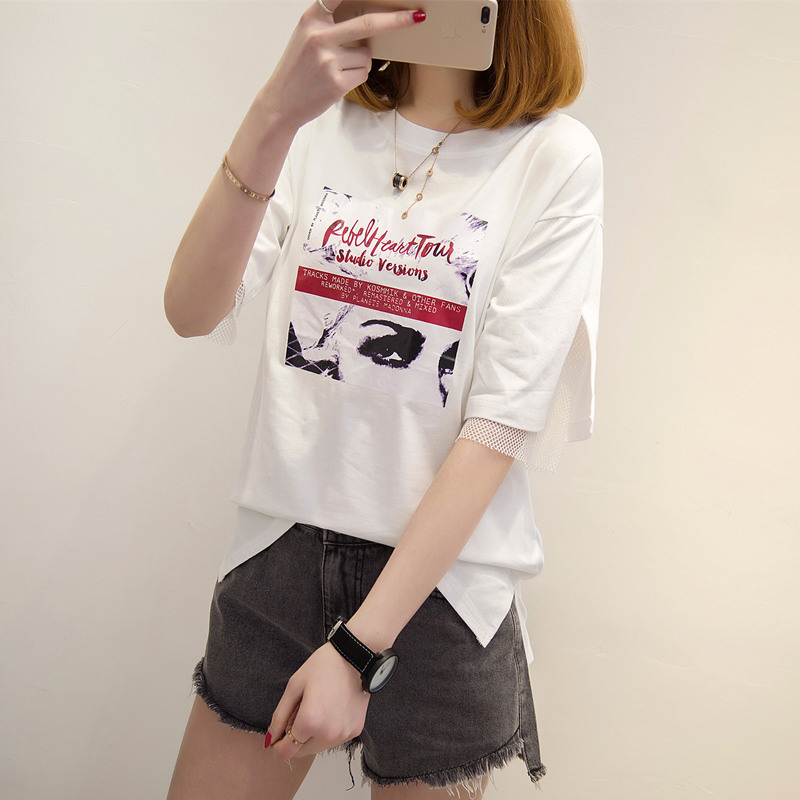 / 女裝夏裝新款潮寬松t恤女短袖網紗假兩件韓版學生中長袖百搭