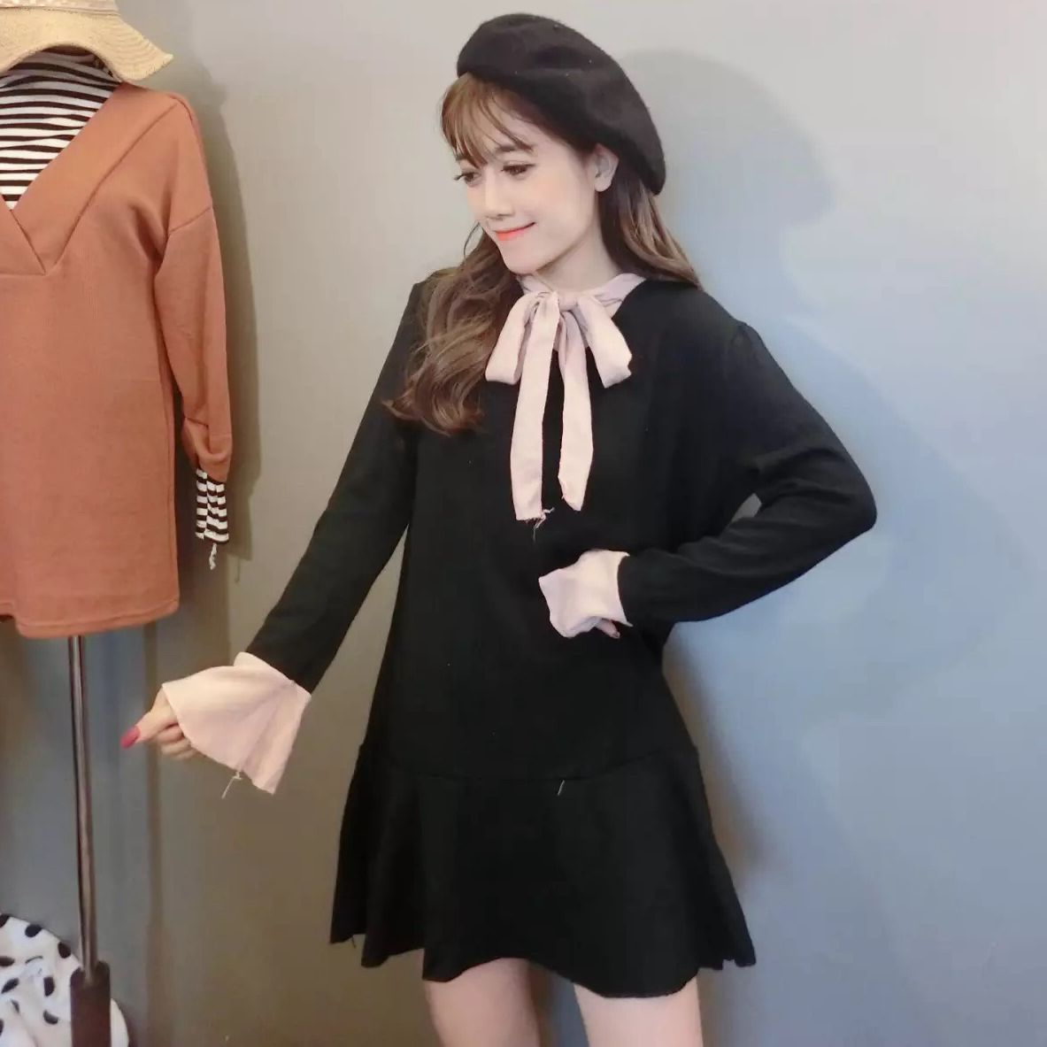 甜美連衣裙春秋款新款韓版學生系帶蝴蝶結長袖荷葉邊打底裙女