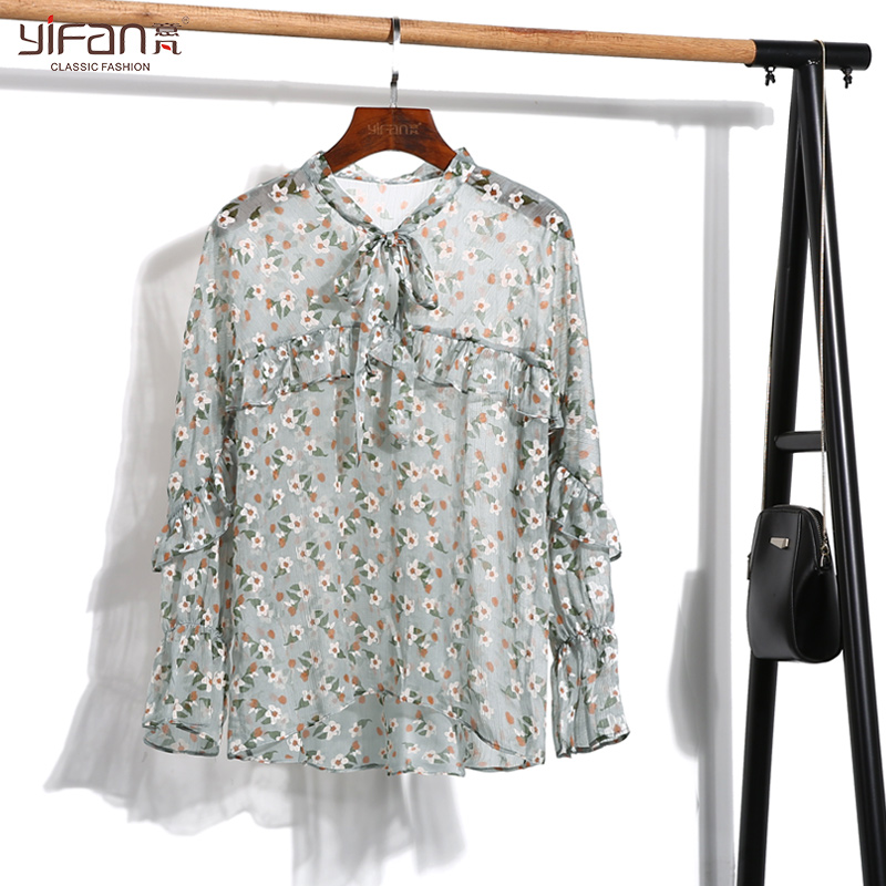 / 春夏新款小碎花喇叭袖雪紡衫女長袖系帶蝴蝶結荷葉邊韓版上衣薄款