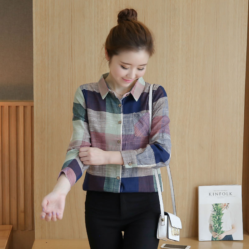 秋冬新款韓范文藝長袖加絨襯衫女棉麻格子學生寬松打底襯衣潮