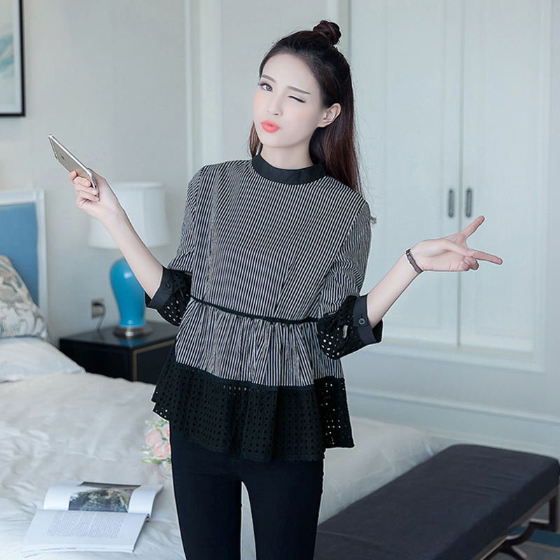 2017春季新款蕾絲拼接燈籠袖條紋襯衫女七分袖寬松顯瘦娃娃衫上衣