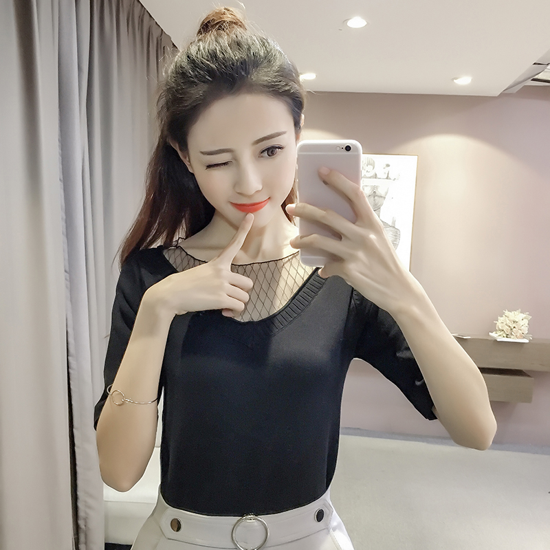 / 夏季新款韓版網紗拼接V領條紋上衣修身顯瘦T恤女短袖打底針織小衫